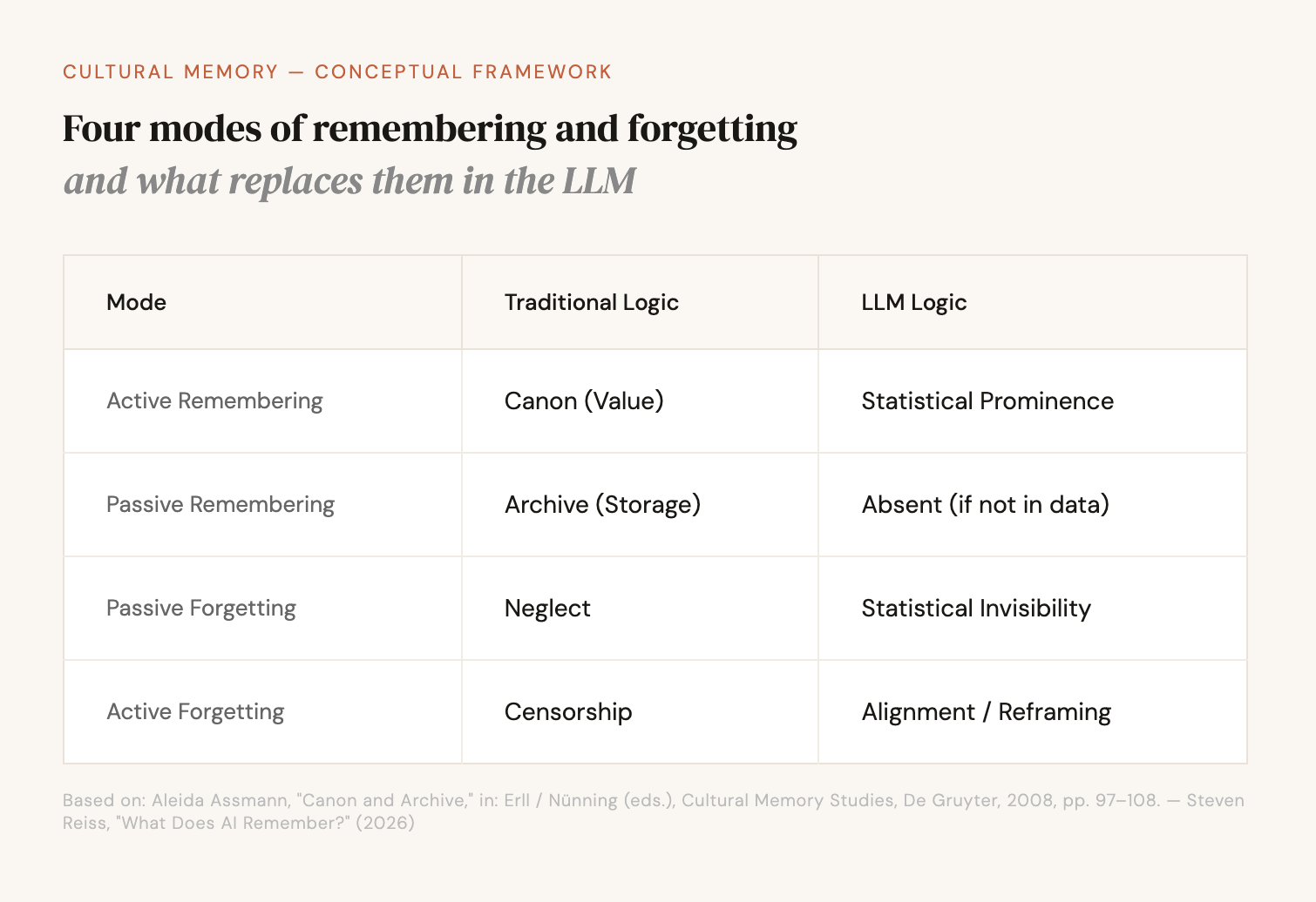 The cultural memory theorist must be careful here. If alignment training does not erase but reframes, then the question is not only what the model “does not say,” but how it says what it does say. Which perspectives are presented as neutral, which are marked as controversial? These shifts are subtler than censorship and therefore harder to capture. Aleida Assmann’s distinction between active and passive forgetting was designed for a world in which memory is either present or erased. LLMs introduce a third possibility: the present that systematically sounds different than it could.