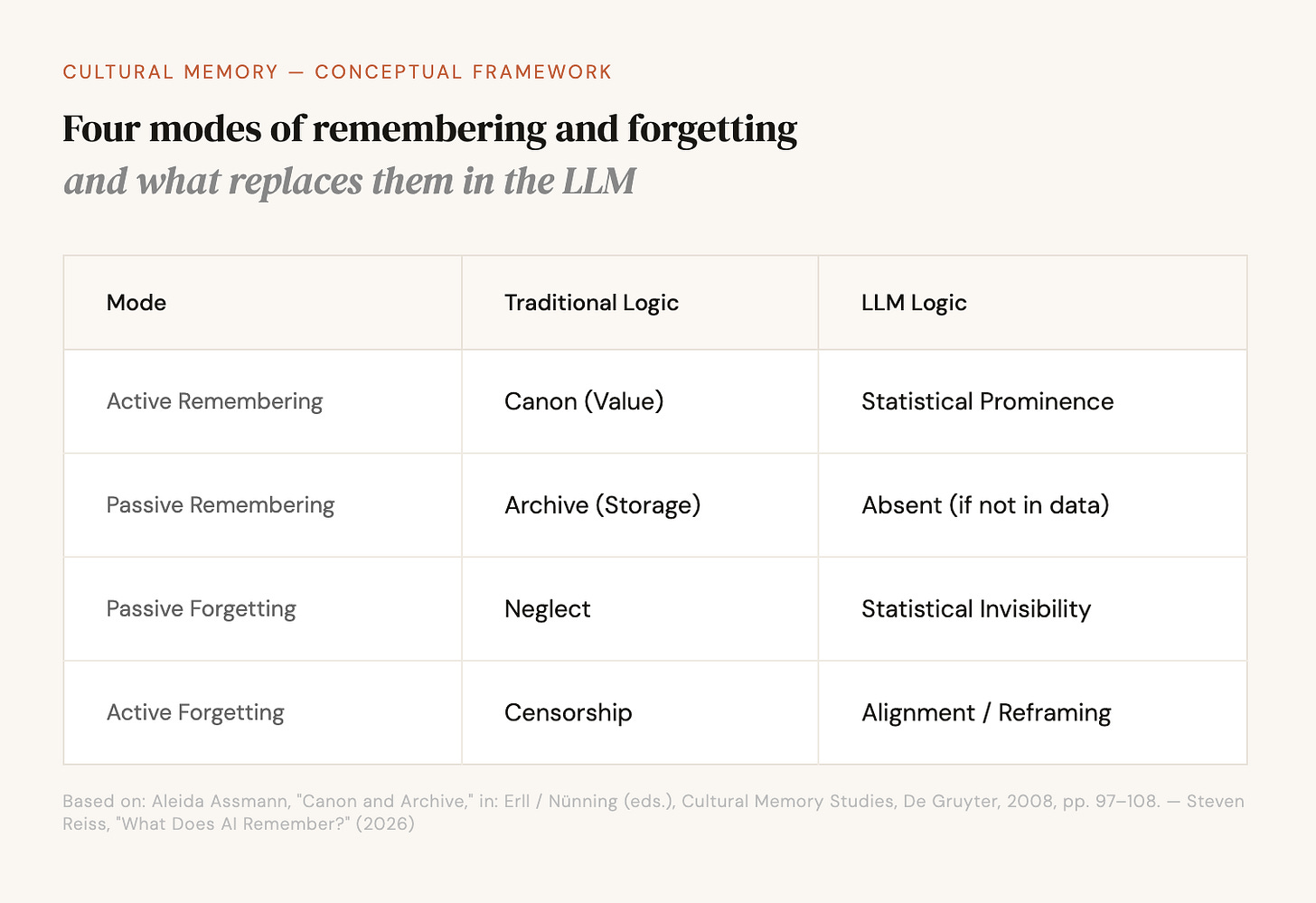 This impression, however, is wrong. The answers are often accurate enough, but the model is neither an archive nor a library. It’s a medium that produces cultural knowledge without the institutions that cultural theorists consider constitutive: no community that authorizes it, no specialists who maintain it. Jan and Aleida Assmann’s theory of cultural memory conceives of memory not psychologically but medially and institutionally (I refer to both, Jan for the institutional theory, Aleida for the media and archive analysis, and treat their work here as complementary, which it is not entirely, but productively so for my purposes). Their analytical toolkit is precise for understanding what LLMs do with cultural knowledge. And it reaches a limit, when applied to LLMs, that structures the entire argument of this essay: Assmann’s toolkit presupposes a constitutive community. LLMs, however, have none. What that means is the actual question. I use the categories that follow (canon, archive, the floating gap, active and passive forgetting) knowing that they will not map cleanly. They are diagnostic instruments developed for a world in which memory has institutional carriers. Applying them to a medium that has none is a deliberate test of their limits, and the points at which they fail are as instructive as the points at which they hold.
